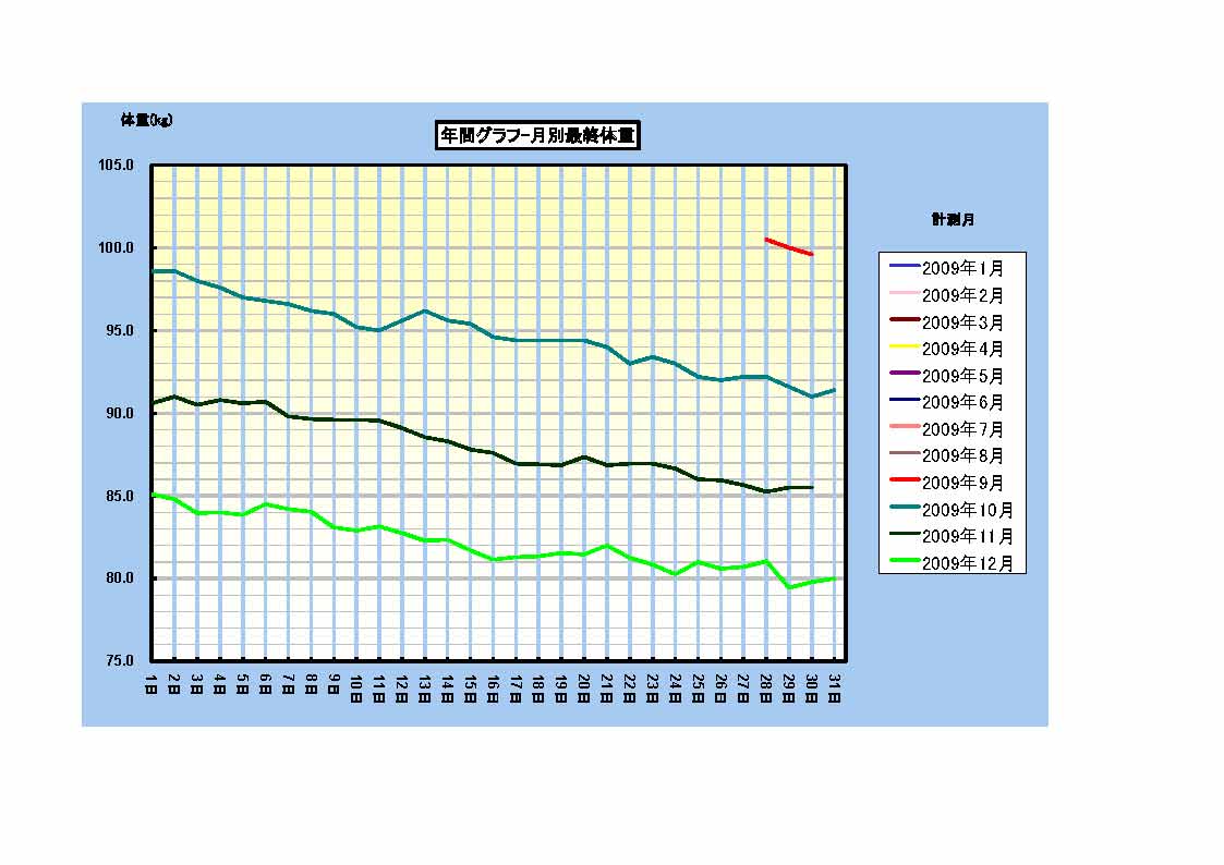を続け、社会人10年を越えた今年、ついに0.1トンの大台を超えてしまったのです!ショックでした。まさか100kgを超えるなんて・・・。ちなみにマックスは102.5kg。マツコ先輩を笑えない体格です。ホンジャマカの石塚も言ってましたが、この辺の体重って2~3kgは近似値なんですよね。そんなに食べているつもりはないんだけど、体重は増える一方。ここらで決意しないと取り返しのつかないことになる!と思い、公開減量に踏み切ったわけです。こちらのグラフを見てください。