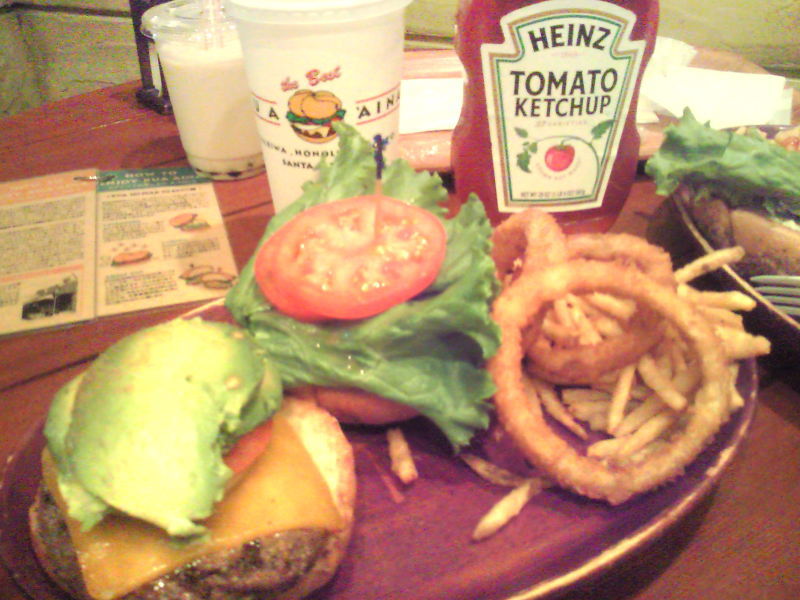 クア・アイナはハワイ語で「いなか」という意味なのだとか。ルーツはワイキキからパイナップル畑を抜けて、車で34マイル北上したところにあるノースショアのハレイワという小さな田舎町なんだそうです。一番安いセットで1100円とちょっと高め。オススメはアボカドバーガーのセットで1400円です!