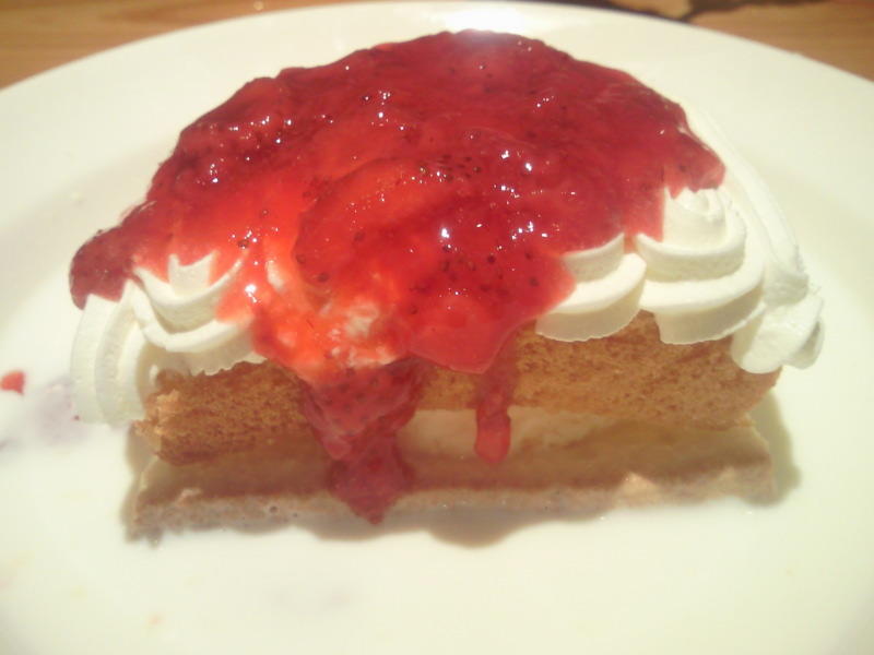 いや、これは好みがわかれるかなー。スポンジケーキにアイスがサンドされていて、その上に生クリームとストロベリージャムがふんだんにのっています。これが、たっぷりのミルクの海に浮かんでいるんですよ!見た目よりサッパリして上品な味に仕上がってます!