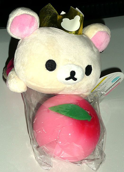 右が通常サイズですよ。この中に東ハトの主力商品がたくさん入っているんです。2000円分くらいかと思うのですが、中身のうれしさよりも、このでっかい袋に満足。これに気をよくして、UFOキャッチャーにもチャレンジ。まわりは小学校低学年くらいの子どもだらけ。でもそんなの関係ねー、と童心に戻り、1000円札を両替。いやー釣れました!コリラックマとぷにょぷにょの変な桃。