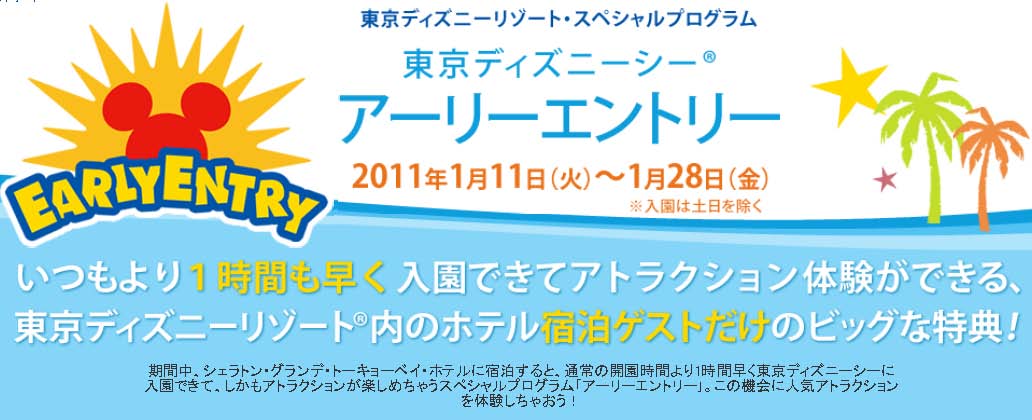 舞浜シェラトンの宿泊予約をするためにホームページを閲覧したところ、1月28日まで「ディズニーシーへのアーリーエントリー」が可能との案内が目にとまりました。朝からインパークやインポートすることなんて滅多にないので今までは気にしたこともなかったのですが、せっかく宿泊するんだったらたまには特典を利用するのもいいなと思い、土曜一日遊ぶために金曜日の宿泊予約をとりました。