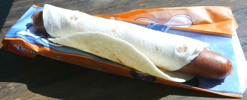 クリッターカントリーの一番奥、スプラッシュマウンテン出口のすぐそばに「ラケッティのラクーン・サルーン」という小さな飲食店があります。ラクーンはアライグマ、サルーンは酒場。語呂合わせですが響きがいいですね。私の記憶だと、昔ここには「スパイシーホットドッグ」があったはずなのですが、メニューが少し変わったようで、今では大きなソーセージを薄い生地で包んだトルティーヤ・ドッグがメインになっています。エスプレッソ味のソフトクリームもオススメですよ。
